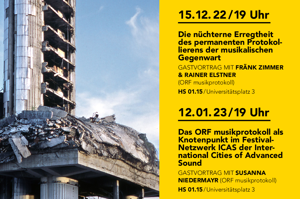 In der begleitenden Lehrveranstaltung beschäftigen wir uns mit aktueller Kunst und Musik, wie sie sich bei einem Mehrspartenfestival wie dem steirischen herbst und dem ORF musikprotokoll vor und hinter den Kulissen präsentiert. Bei den gemeinsamen Konzert- und Veranstaltungsbesuchen setzten wir uns mit neuen künstlerischen Konzepten, Werken, Kompositionen, Performances, Installationen etc. auseinander, um danach über unsere Eindrücke und Einschätzungen aktueller Tendenzen in Kunst und Musik ins Gespräch zu kommen. Intendanz, Kuratorinnen und Kuratoren und Festivalmitarbeiterinnen und -mitarbeiter geben uns Einblicke in die Programmgestaltung und informieren in Gesprächsrunden, Vorträgen und Diskussionen vor Ort in den „herbst headquarters“ sowie an der Universität über historische und aktuelle Hintergründe der internationalen Festivalsorganisation.