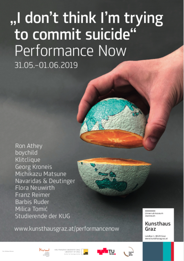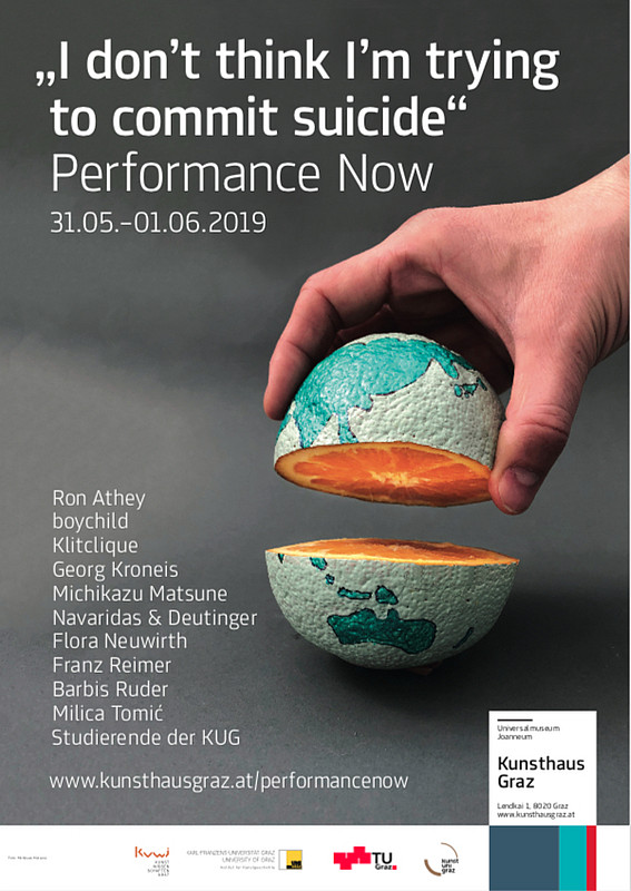 Ergänzend zum KUWI Graz Jahresthema Performativität in den Künsten findet am letzten Maiwochenende die Performancereihe „I don’t think I am trying to commit suicide” im Kunsthaus Graz statt. Diese ist ein In-Between-Projekt, das zum einen in den Phasen des Ausstellungsumbaus stattfindet. Zum anderen bewegt sich das Programm bewusst zwischen den Sparten der Künste und präsentiert Künstler/innen, die sich durch ihre Praxis weder ausschließlich der bildenden noch der darstellenden Kunst zuordnen lassen.