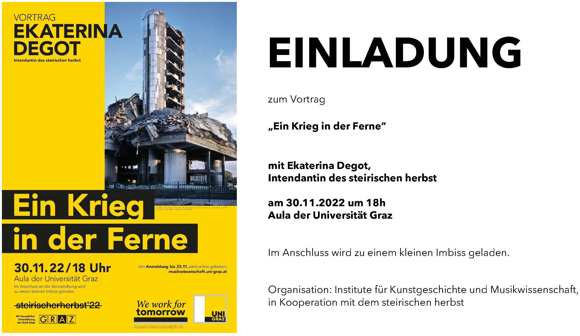 Die Institute für Kunstgeschichte und Musikwissenschaft und der steirische herbst freuen sich sehr, zum Vortrag "Ein Krieg in der Ferne" von Ekaterina Degot am 30.11. um 18 Uhr in der Aula der Universität Graz, einladen zu dürfen.